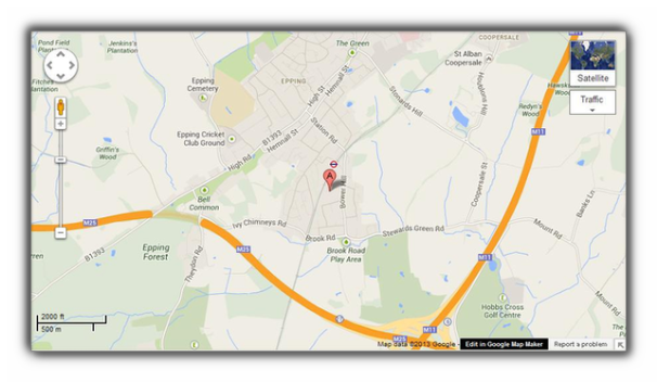 Proceed to Junction 7 of the M11 (Hastingwood Roundabout Harlow) from the northbound exit take the 1st exit onto London Road (B1393) , from the southbound exit take the 3rd exit.